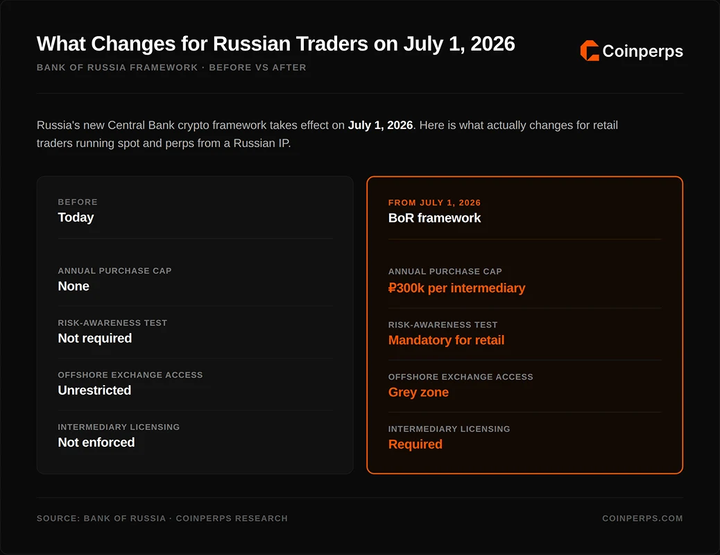 The more important development is the Bank of Russia's December 2025 framework proposal, landing July 1, 2026. Non-qualified investors will be able to buy up to ₽300,000 of crypto per intermediary per year after passing a mandatory risk test. Qualified investors face no volume cap but still need to pass the test.